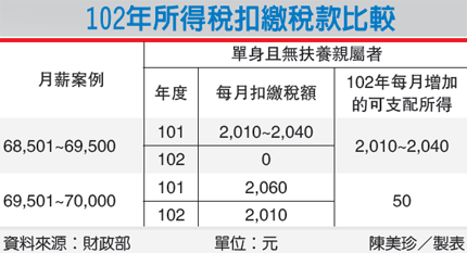 起扣門檻調高後,以單身無扶養親屬者為例,每月薪資低於6.95萬元,將不必再按月扣繳所得稅。
