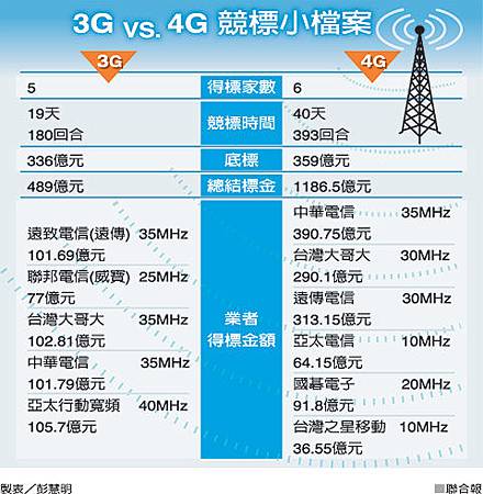 語音和影像傳輸超快速的第四代行動通訊(4G)執照競標,歷時40天、393回苦戰後,昨結果出爐,開出1186.5億元天價標金,4G時代將是中華電、遠傳、台灣大、國碁電子(鴻海)、亞太和台灣之星(頂新)6強鼎立局面。 中華電以390.75億元最高標金獲最佳頻段,預計明年開台,進入國內電信史上最快傳輸速率時代。以下載1張約2MB的照片為例,3G需4秒,4G僅需0.8秒。
