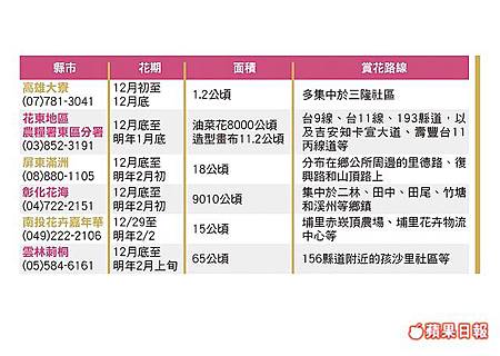 今年彰化花海種植面積總計達9010公頃,民眾可於溪州與田尾等地欣賞,觀賞期由12月底到明年2月初。
