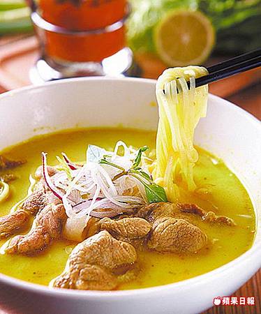 香茅咖哩湯+禾麥豬肉150元。吸足咖哩湯頭的河粉,吃來軟Q夠味。