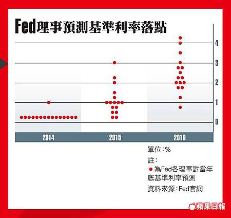 巴克萊美國首席經濟學家麥奇指出,改以參考多種指標的質化指引後,市場唯一能夠量化利率預估的參考資料,只有Fed理事的利率落點預估,葉倫記者會上表達的立場或許改變不大,但利率落點預測顯示,理事對升息時間點預期已顯著改變。 FROM:蘋果日報