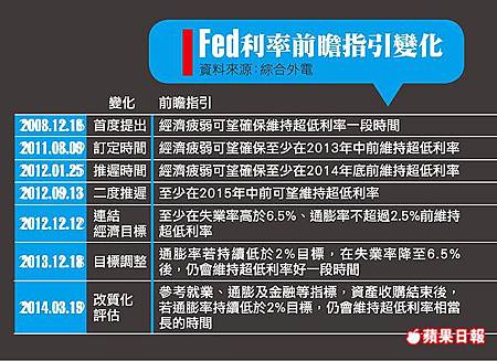 在此次會後聲明中,Fed並調整利率前瞻指引。由於美國失業率已降6.6~6.7%,Fed不再把失業率6.5%、通膨率2.5%作為升息參考依據,認為用失業率界定就業市場健康狀況將有侷限性,改參考就業、通膨及金融等指標,資產收購結束後,若通膨率持續低於2%目標,仍會維持超低利率相當長的時間。