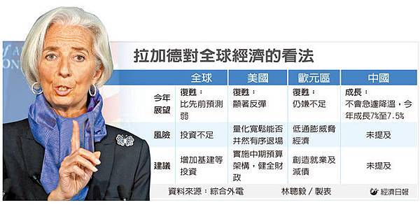 國際貨幣基金(IMF)總經理拉加德表示,全球經濟活動今年下半年將增溫,明年會再加速,但由於各國投資依舊偏低,成長動能可能比預期弱,暗示IMF將微幅調降全球經濟成長預測。