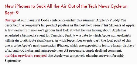 Re/code說,9月9日的發表會將會發表蘋果下一代iPhone,螢幕尺寸為4.7吋和5.5吋,並有更快速的處理器。