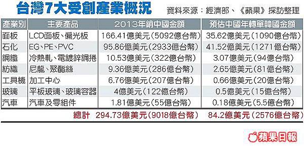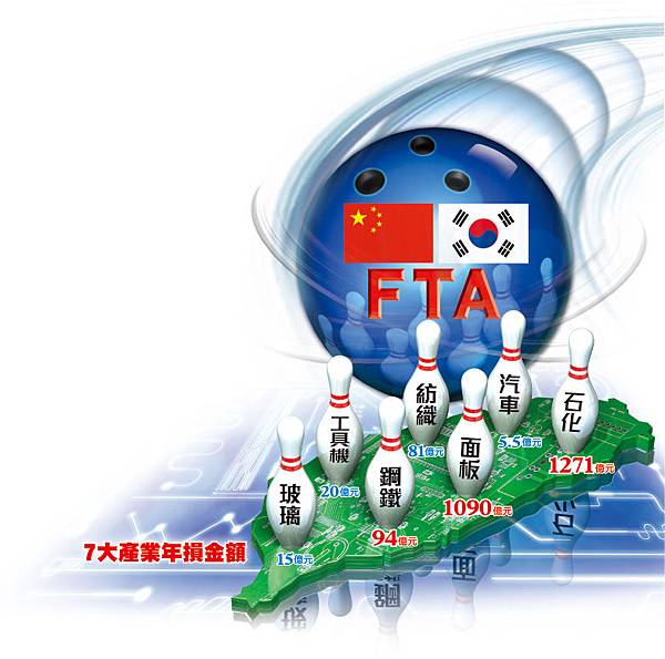 【綜合報導】中、韓領導人昨在北京宣布,兩國已結束FTA(自由貿易協定)實質談判,可望於明年正式簽署協定,雙方將逐步取消逾90%產品項目及85%貿易額的關稅。經濟部估計中、韓FTA最快明年第2季生效,將衝擊台灣面板、石化、鋼鐵、紡織等7大產業;次長卓士昭表示,包括轉單等影響,未來3至5年對台灣產值將有2600億至6500億元衝擊。業界昨一片哀號,有人直呼:「這是一個大災難!」估算恐影響逾90萬人生計。 中韓將簽FTA,對台灣面板、石化、汽車等7大產業衝擊大,業界推估恐影響逾90萬人生計。資料照片
