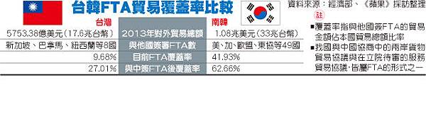 對中、韓簽定FTA,我國經濟部次長卓士昭憂心指出,中國是南韓最大貿易夥伴,佔南韓去年總出口的26.05%,目前韓國與49國簽署FTA,貿易覆蓋率41.93%,中、韓FTA生效後,韓國不但成為亞洲地區首個與歐盟、美國、中國完成FTA的國家,貿易覆蓋率更直衝62.66%。 反觀台灣,目前僅與8國簽署FTA,貿易覆蓋率9.68%,未來即使與中國完成ECFA(Economic Cooperation Framework Agreement,兩岸經濟合作架構協議)下的服貿、貨貿協議,貿易覆蓋率也僅27.01%,意指我出口100美元中只有27.01美元免稅,韓國卻有62.66美元免稅,由於台、韓是競爭對手,對我方更不利。