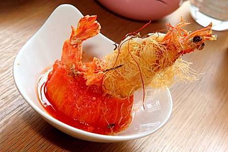 店內的名菜番茄盅天蠶蝦不僅看起來精美誘人,吃起來也是非常美味。把麵線包在新鮮蝦子外面下油酥炸,上桌時麵線已經炸酥,吃起來輕盈香脆,而裡面的蝦肉還是又嫩又彈,口感紮實。再搭配下面的燉番茄一起吃,酸甜可口,非常開胃。