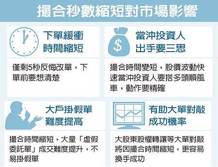 競價搓合 縮短至5秒 今(29)日開始,台股集中市場,集合競價搓合秒數均將縮短至5秒。 市場人士認為,將有助提高台股的交易效率與透明度,但股價波動幅度可能因而提高,大戶、散戶、甚至包括券商營業員都將面臨全新挑戰。 台新投顧總經理莊明書、CMoney理財寶、第一金投顧董事長陳奕光認為,交易新制主要影響四大層面。首先,在一般投資人方面,由於原本送出交易委託單後,最多還有10秒可以反悔,現在只剩5秒可以改單,所以在下單前一定要謹慎。 其次,如果看到市場上有大單在買進股票,股價往上衝的時候,原本有10秒的反應時間,現在只剩下5秒,因此,對當沖等投資人來說,需要手腳更快,否則就可能會用更貴的價錢買進或用更低的價錢賣出。