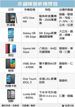 【六大手機廠拉貨 供應鏈風光】 手機大廠新機將從本月中旬開始陸續上市,包括宏達電、三星、索尼等六大手機廠,將推出九款以上新機,帶動手機晶片、鏡頭模組、驅動IC、散熱導管等需求,供應鏈進入出貨旺季。 宏達電看好M9的設計及個性化介面,搶先在發表會後半個月內上市;三星則預期,S6可望超越先前銷售成績亮麗的S4(S5銷量不如預期)。 由於手機功能普遍提升,帶動處理器升級,手機溫度也會拉高,因此已有許多手機加入散熱導管設計,將使手機散熱導管概念股奇鋐、超眾等具備題材。