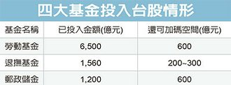 政府四大基金力挺台股,據各基金提供的資料估算,備妥規模高達1,500億元,將伺機投入股股市,為台股增添更多資金活水。