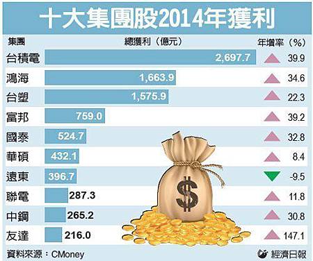 早安^^ 期貨小靜來報新聞囉! 【2014財報六天王 照亮台股】 上市櫃公司2014年財報昨(31)日全數公布,六大天王照亮台股,台積電稅後純益2,638億元榮登獲利王;大立光每股稅後純益(EPS)144.91元,每股最會賺;南亞科則因減資,股東權益報酬率(ROE)109.8%居冠。 橡膠股厚生營益率達60.4%,這顯示企業主對直接成本與間接成本控管得當。矽智材廠力旺去年毛利率100%,為台股毛利率王;匯兌收益王為三商,去年匯兌收益高達94.29億元。 堅持專業晶圓代工之路的台積電,走出與整合元件大廠不同的市場區隔,屢屢憑藉晶圓代工技術領先,一步步從三星、英特爾手中,搶下對手失去的市占率。