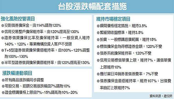 【陸股強漲 股民瘋買 外資落跑】 亞洲股市今年來表現搶眼,陸股漲幅高達16%,同期日股漲幅逾10%,成為亞股前2強,但彭博報導指出,在中國股民以創紀錄的速度瘋狂開戶搶搭大漲列車之際,外資已開始獲利了結、撤出陸股。 人行可能降息3碼 上海1位基金經理坦言,目前維持大盤走強的主要因素,甚至唯一的因素就在於貨幣寬鬆帶來的資金湧入,「在場外資金不斷入市的背景下,短期風險在於市場取向的轉變,以及創業板瘋狂飆漲之後的政策風險」。 《台灣主要報紙頭條要聞》 台股漲跌幅由7%擴大為10%,確定提早到6月1日上路,相關配套如擔保維持率由120%提高到130%,也提前一個月實施,預計5月4日先行。這是台股漲跌幅26年多來最重大的變革。 ■ 工商時報 上市櫃去年獲利 1.86兆創新高 台股漲跌幅10% 提前6月起實施 談兩岸 柯P提一五新觀點 國台辦:讚 ■ 聯合報 亞投行 我昨遞意向書 北市警 不再管27項冗事 股市漲跌幅6月起放寬至10% ■ 經濟日報 讚 上市櫃大賺1.8兆 台股漲跌幅 6月放寬至10% 水汙費5月開徵 《重要新聞》 ■金管會31日宣布,經台灣證券交易所、證券櫃檯買賣中心、台灣期貨交易所及證券(期貨)商公會等單位,規劃完成相關配套及宣導計畫,並調查相關單位電腦系統調整時程後,放寬股市漲跌幅至10%提前至今年6月1日實施。金管會主委曾銘宗還特地在臉書(facebook)發文,公布此台股大變革!more... ◇美股 ■道瓊工業平均指數收低200.19點或1.11%至17776.12點 ■Nasdaq指數收低46.56點或0.94%至4900.88點 ■S&P 500指數收低18.35點或0.88%至2067.89點 ■費城半導體指數收低8.26點或1.17%至695.48點 ◇亞股 ■日經225指數 31 日收盤下跌204.41點或1.05%,報19206.99點,開盤19592.43點。 ■韓國Kospi指數 31 日收盤上漲10.99點或0.54%,報2041.03點,開盤2042.31點。 ■澳洲S&P/ASX 200指數 31 日收盤上漲45.42點或0.78%,報5891.51點,開盤5846.10點。 ■上海綜合指數 31 日收盤下跌38.67點或1.02%,報3747.90點。 ■香港恆生指數 31 日收盤上漲45.77點或0.18%,報24900.889點。 資料來源:鉅亨網 udn