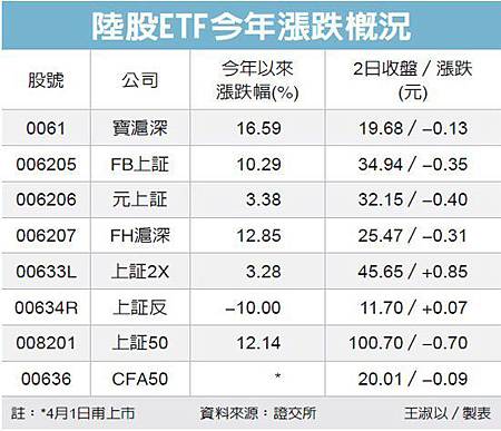 早安^^ 期貨小靜來報新聞囉! 【陸股變蠻牛 帶旺ETF】 陸股本波走勢強勁,台股連結陸股的ETF也明顯受惠。台股老牌的陸股ETF寶滬深(0061)今年以來大漲16.59%,漲勢最犀利。寶滬深是元大寶來投信發行連結式ETF,連結標智滬深300 ETF,由於較早掛牌交易,投資人也相對較為熟悉,商品交易情況在同類型ETF中也較為熱絡。 中國證監會及人民銀行的政策做多支撐下,陸股漲勢猛烈。不過陸股ETF漲勢遜於大盤,是由於陸股震盪幅度加大,降低投資人追高意願,加上台股與陸股又有交易時間差,導致陸股ETF折價。