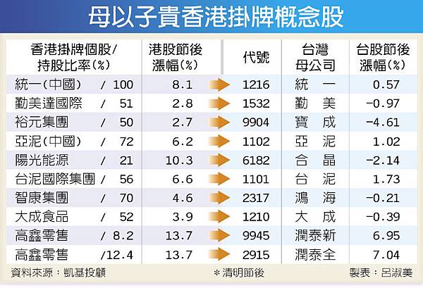 凱基投顧統計,母以子貴股至少包括:統一、勤美、寶成、亞泥、合晶、台泥、鴻海、大成、楠梓電、潤泰新及潤泰全等10檔個股。