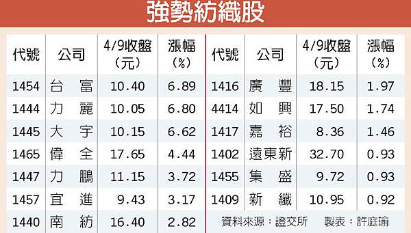紡織指數近期來勢洶洶,屢創歷史新高,前陣子在Under Armour以及Nike供應鏈帶動下,紡織下游族群率先領漲,日前則碰到中國古雷石化工廠發生爆炸,原物料報價有機會喊漲,激勵台灣上游加工絲股價表現,昨日相關供應鏈包括力麗(1444)、大宇(1445),和台富(1454)都攻上漲停。