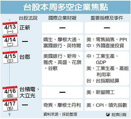 《台灣主要報紙頭條要聞》 台股在這波亞洲股市漲聲中漲幅落後,據金管會掌握相關資金動能顯示,今年來外資仍持續匯入,到4月9日累計淨匯入92億美元(約新台幣2,880億元),許多匯入的外資仍在等待時機,散戶部分融資券也未特別增加,台股彌漫等待氣氛,後續有機會出現新一波漲勢。 ■工商時報 兩岸租稅協議 大陸讓利 金管會:台股是下波補漲市場 希拉蕊問鼎白宮 歐巴馬按讚 ■經濟日報 台積電資本支出 加碼至4030億 股東會大戲 489家要改選 陳德銘:兩岸經貿 面臨三新機遇 《重要新聞》 ■證交所今(10)日公告,從事信用交易投資人注意,配合股市漲跌幅度將在今年6月1日放寬至10%,信用交易最低整戶擔保維持率,將從今年5月4日起,由120%提高為130%,比放寬漲跌幅度提早1個月實施,可使投資人在原漲跌幅度環境下先行適應制度調整,證交所強調,雖然5月4日先實施,不過給予投資人1個月的緩衝期調整信用交易部位,因此在5月4日至6月1日期間,信用交易維持率低於130%,仍在120%以上,擔保品暫不會被處分。more... ■台塑四寶今(10)日公佈今年首季財報,國際油價不振、拖累塑化產品報價,且因農曆春節工作天數減少,相較去年第4季四寶合併營收皆衰退,但台塑、台化、台塑化轉虧為盈,四寶全部獲利,南亞以單季每股淨賺1元榮登獲利王。more... ■受惠於歐洲央行(ECB)的量化寬鬆計畫(QE),歐股今年來持續走高,昨日泛歐Stoxx 600指數大漲1.1%,收在409.15點,突破2000年網路泡沫化前的405.50點,創下歷史收盤新高。more... ■根據CNNMoney報導,期盼已久的Apple Watch終於正式推出了。客戶現在可以線上訂購此一智慧型手錶,也可在部份蘋果商店裡,試用此一最新產品。more... ◇美股 ■道瓊工業平均指數收高98.92點或0.55%至18057.65點 ■Nasdaq指數收高21.42點或0.43%至4995.98點 ■S&P 500指數收高10.88點或0.52%至2102.06點 ■費城半導體指數收高2.87點或0.41%至709.05點 ◇亞股 ■日經225指數 10 日收盤下跌30.09點或0.15%,報19907.63點,開盤19989.55點 ■韓國Kospi指數 10 日收盤上漲28.89點或1.4%,報2087.76點,開盤2066.32點 ■澳洲S&P/ASX 200指數 10 日上漲36.15點或0.61%,報5968.37點,開盤5932.20點 ■上海綜合指數 10 收盤上漲76.78點或 1.94%,收盤報 4034.31點,成交金額6685.04億元人民幣。 深成指數收盤上漲216.60點或 1.57%,收盤報 14013.34點,成交金額5949.51億元人民幣 ■香港恆生指數 10 日收盤上漲328點或 1.22%,收盤報 27272.39點,成交金額2211.45億港元。 國企指數收盤上漲239.16點或 1.74%,收盤報 13987.52點,成交金額485.828億港元 資料來源:udn 鉅亨網