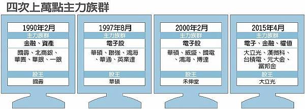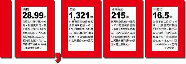 台股昨日行情為證券史上第四次攻上萬點,前三次分別是1990年的12,682點,1997年的10,256點,2000年的10,393點;主要推手外資繼上周五大買464億元後,昨日再度買超215億元;累計外資今年來累計買超1,983億元,光是近五個交易日就占1,001億元。昨日拉升台股見到萬點的族群仍是金融,金融指數繼續走揚,收盤上漲2.3%收1,244點,為1999年7月12日以來最高。