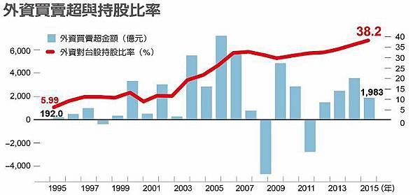 且以外資在2000年萬點時,持有台股市值僅1兆2300多億元,持股比重約15%多,到昨天持股市值近11.2兆,持股比重超過39%,持有市值規模大幅攀升,且高持股的股票如台積電(2330)、日月光(2311)、矽品(2325)等股價表現不弱。