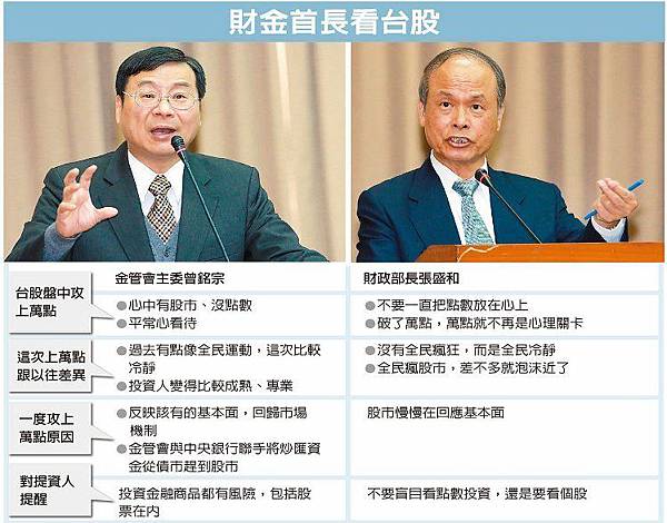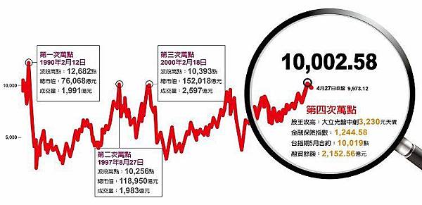 台股昨日指數攻抵萬點大關,在外資長線共同基金等買盤聯手進場點火下,早盤9時59分後指數登上萬點達10,002點,但受台積電、聯發科等電子大型權值股走疲拖累,終場指數以上漲59點,以9,973點做收,為15年來新高,成交值略縮為1,304億元。