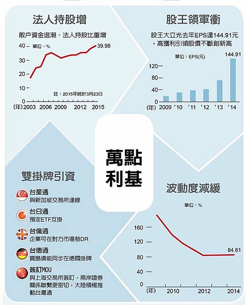事實上,今年首季5大外資券商已將台股目標指數上調至萬點,原先外資預期,萬點行情會在下半年發動,不過,在台滬港比價行情發酵下,吸引對沖基金及中長線資金大舉湧入落後的台股,外資近3天大買904億元,資金狂潮帶領突破萬點。