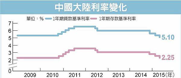經濟情勢嚴峻 迫使人行持續寬鬆貨幣 專家:不應解讀為中國版QE 中國人民銀行(大陸央行)今天宣布自5月11日起,全面調降金融機構人民幣貸款和存款利率1碼(0.25個百分點)。這是2014年11月以來人行第三度降息,也是三周來兩度擴大寬鬆,期間還曾二度降低存款準備金率,凸顯大陸經濟情勢嚴峻,迫使人行持續寬鬆貨幣。 人行昨日宣布,自今天起下調金融機構存貸款基準利率各0.25個百分點,調整後的1年期貸款基準利率為5.1%,1年期存款基準利率為2.25%。