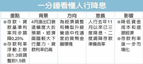中國人民銀行(大陸央行)今天宣布自5月11日起,全面調降金融機構人民幣貸款和存款利率1碼(0.25個百分點)。這是2014年11月以來人行第三度降息,也是三周來兩度擴大寬鬆,期間還曾二度降低存款準備金率,凸顯大陸經濟情勢嚴峻,迫使人行持續寬鬆貨幣。