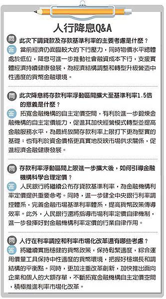 同時,人行將金融機構存款利率浮動區間上限,由存款基準利率的1.3倍調整為1.5倍。人行昨天在新聞稿中指出,此次進一步下調存貸款基準利率,重點就是要繼續發揮好基準利率的引導作用,進一步推動社會融資成本下滑,支援實體經濟持續健康發展,要為經濟調整和轉型升級營造中性適度的貨幣金融環境,並繼續實施穩健的貨幣政策。 人行研究局首席經濟學家馬駿認為,此次下調利率主要是因為經濟面臨較大下滑壓力,有必要透過降低名義利率,來達到降低實際利率、穩定投資增長的目的。他強調,不應該將這次解讀為中國版的量化寬鬆(QE)。