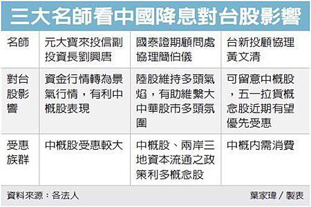 ■ 工商時報 半年降3次 穩經濟 陸降息1碼 抓漏總動員 預售屋紅單轉手 全面大查稅 因應缺水危機 台塑六輕砸50億 籌建海水淡化廠 ■ 經濟日報 陸降息1碼 半年第三次 最便宜股市 俄第1...台灣第6 葉門停火 油價看跌 ■ 旺報 陸再降息1碼 放寬存款上限 陸一線城市大風吹 深上廣下 32項合約 中俄簽250億美元大單 《重要新聞》