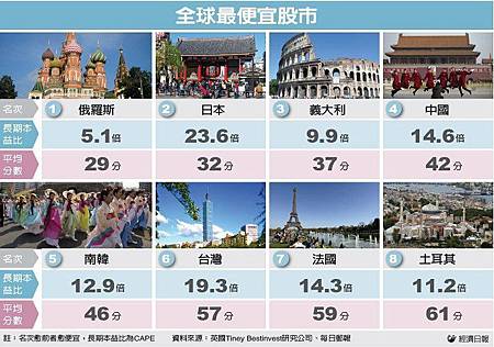 英國Tiney Bestinvest研究公司針對全球20個主要股市,以長期本益比、年度本益比及股價淨值比等三項指標進行評比,結果顯示台灣股市為第六便宜,而美國股市最貴,俄羅斯最便宜。