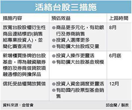台股2大利多政策來了!金管會昨宣布,6月1日起擴大現股當沖標的,新增認購(售)權證股票和ETF(指數股票型基金)都可當沖;其次,8月起放寬各銀行銷售的台股股權衍生性商品,將可連結所有上市櫃股票,2大利多都有助推升台股量能,投資人選擇投資商品也更多元。