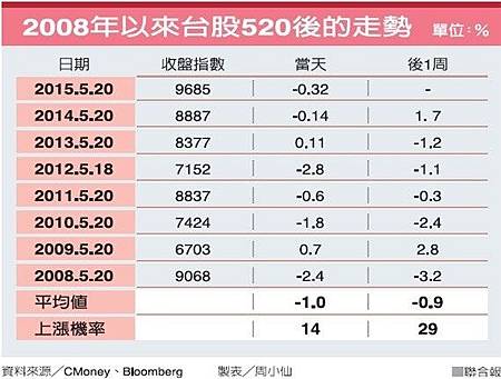 昨天適逢5月20日總統就職滿七周年,但台股並未展現520慶祝行情,反而受台指期壓低結算影響,指數收盤下跌31點至9685點,頗有落入「520魔咒」的味道。