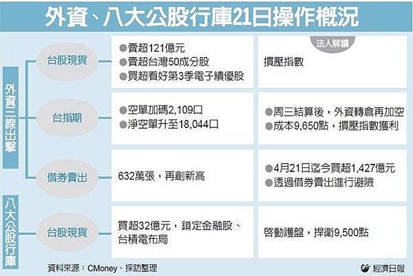 台股昨(21)日因大巨蛋停工、影響聯貸的銀行團,外資大賣金融股,總計賣超台股121億元,致使終場大跌106點,收在9,578點,成交值967億元;同時在台指期空單加碼2,109口,淨空單升至18,044口。但八大公股行庫啟動護盤,擴大買超32億元,為近一個月最多。 外資昨天摜殺台股,開盤以大巨蛋停工為題、金融股為主要標的,狙擊台灣50成分股,最深一度跌164點。分析師表示,外資、八大官股行庫角力戰將很有看頭。 觀察台股邁向萬點之路的過程,外資及八大公股行庫的操作完全相反,外資一路帶頭衝,八大公股行庫則減碼,再加上台股量能不繼,使得萬點快閃。但外資從4月21日一路買上來的1,427億元的台股現貨必須進行避險,外資因此在台指期加碼空單,借券賣出餘額也居高不下,是行情忽多忽空主因。 第一金證投顧董事長陳奕光表示,八大公股行庫從萬點後持續減碼台股,對照外資同一時間的買超,公股行庫則賣超達349億元,且外資的台指期空單、借券賣出的空方力道猛烈,不排除八大公股行庫將為了捍衛再啟動軋外資期貨、借券賣出及軋空手的三軋行情,迎接6月1日即將上路的揚升方案政策。 大股東申讓賣壓 湧現