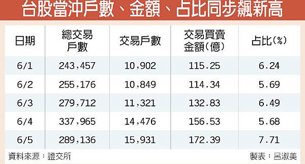 累計上周一整周下來,當沖買賣交易金額達691.34億元,占台股周成交值占比6.35%,也是雙雙改寫歷史單周新紀錄。