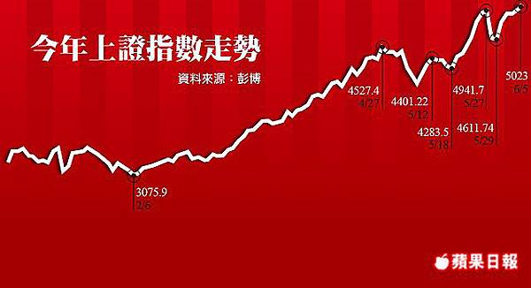 上海證券(上證)綜合指數上周震盪走高,周線暴漲近9%,7年來首度站上5000點大關收在5023點。據中國《紅周刊》報導,暴起暴跌成陸股新常態,本月行情將進入新階段,由「單邊任性上漲」轉為震盪上行,慢牛行情漸成市場共識。