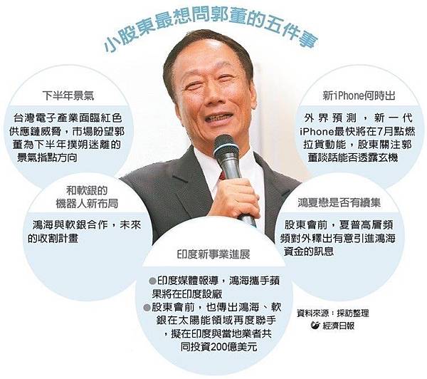 鴻海股東會今天登場,小股東最想問郭董下半年景氣動向、與軟銀的機器人新布局、印度新事業進展、新iPhone何時問世、鴻夏戀是否有續集等五大議題。