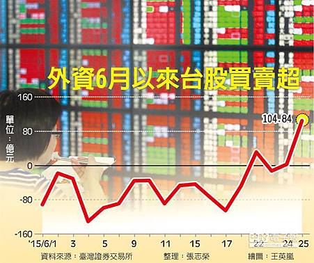 外資重回台股懷抱,再現百億元買超!巴克萊資本、瑞信、港商野村證券等外資指出,科技股庫存修正宣告完成,看好第三季由蘋果供應鏈所領軍的台股波段行情,外資昨(25)日大舉買超台股104.84億元,創下4月29日以來買超新高,帶動指數上漲79點收復月線。