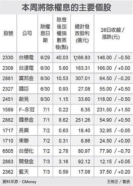 在除權息觀戰重點上,若依照今年發放的股息、上周五(26日)收盤價、及市值比重來推算,本周加權指數將蒸發79.66點、櫃買指數蒸發0.66點。上市權值最大的台積電,除息將影響加權指數消失40.03點,富邦金也將讓指數蒸發10.53點,國泰金8.62點、台達電5.6點、開發金3.16點、台塑化2.78點。 全曜財經資深分析師陳唯泰表示,雖然上市櫃個股在除權息當天,股價會因股息發放而下跌,但對投資人來說,其所擁有市值卻不變。
