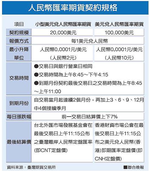 期交所推出的兩檔人民幣匯率期貨分別為契約規模2萬美元的「小型美元兌人民幣匯率期貨」,及10萬美元的「美元兌人民幣匯率期貨」,採現金結算,分別以財團法人台北外匯市場發展基金會之臺灣離岸人民幣定盤匯率(臺灣CNT定盤價)以及香港財資市場公會之美元兌人民幣即期匯率定盤價(香港CNH定盤價)作為最後結算價。交易時間為銀行營業日上午8點45分至下午4點15分,涵蓋臺灣外匯現貨市場交易時段,提供交易人依現貨市場狀況從事交易。 期交所人民幣匯率期貨正式上市日期尚待主管機關核准,預計7月下旬上市。掛牌上市後,貿易商、銀行、人民幣存款人或其他人民幣資產持有者等,即可透過匯率期貨進行人民幣匯率的交易、避險及套利,同時亦可吸引國際法人機構參與,提升臺灣期貨市場之國際化程度及競爭力。