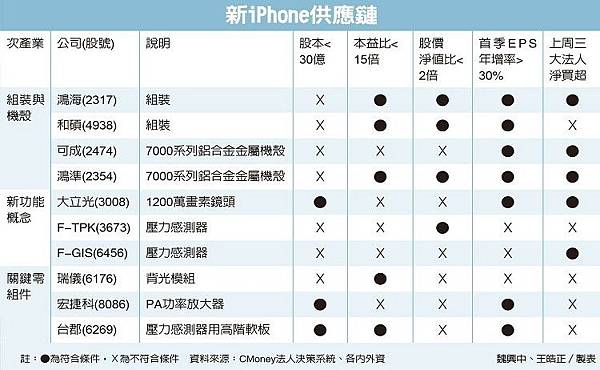分享蘋果iPhone 6s/6s Plus將於9月正式面世,相關台系供應鏈已開始緊鑼密鼓的出貨,成為挹注下半年營運成長的最大保證。外資圈普遍預期,蘋概股中的新iPhone供應鏈,將成為下半年台股投資聚焦的亮點。根據法人圈的研究、以及陸續曝光的間諜照推測,雖然新iPhone僅屬小改款,外觀樣式等變化不大,但實際上,不少功能均進一步升級,包括後鏡頭提升至1,200萬畫素、導入壓力感測器、金屬機殼改採7000系列鋁合金等。 外資圈認為,隨著新iPhone成為下半年最重要的智慧機款,將吸引全球目光,加上果粉的支持力挺,預估今年底前銷售量將上看9,000萬支,帶動台系相關供應鏈,包括鴻海、和碩、可成、鴻準、大立光、F-TPK(宸鴻)、F-GIS(業成)、瑞儀、宏捷科、台郡等營運看俏,並成為台股多頭積極追買的重要族群。