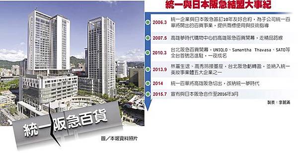 繼與日本無印良品分手後,統一集團昨(7)日宣布,明年將終止與日本阪急阪神百貨的合作關係,統一阪急百貨也將進行更名,此合作協議結束後,對統一營運及消費者權益並無影響;此外,統一集團與阪急阪神百貨有很多業態類似,未來還會有合作的空間。