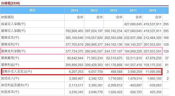 台積電2330 依其營業毛利淨額 2011年與2014年相比 其毛利淨額確實有成長近2倍。