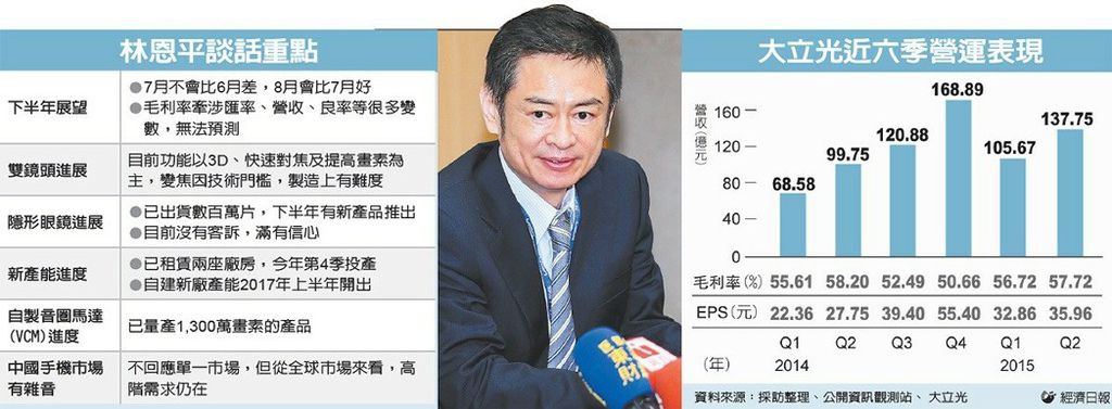 林恩平說,手機雙鏡頭仍是趨勢,用在補光、快速對焦、補充畫素方面,已開始出貨,但用在光學變焦(Zoom)上,各業者都在努力。不能確定下半年雙鏡頭模組出貨量會不會提升,主要看客戶產品銷售狀況、拉貨情形才知道。 林恩平表示,根據經驗,下半年多半比上半年好。但是否表示大立光毛利率上升或出貨量增加,無法預期,因還有很多變數。 法人對下半年景氣、雙鏡頭趨勢充滿高度興趣,「馬拉松式」連續發問將近一小時,有別過去半小時到40分鐘結束、中間還偶有「冷場」的狀況,最後趁發問的空檔,大立光自己「喊停」,法說會盛況空前。