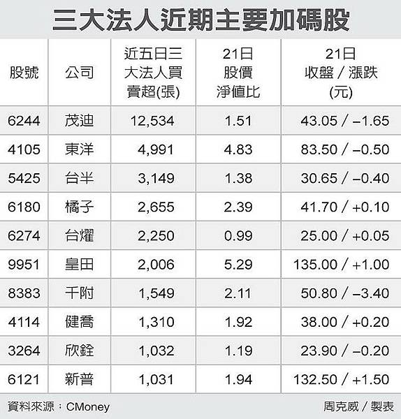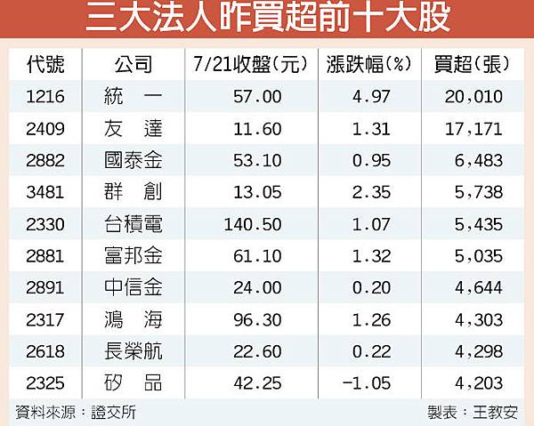 三大法人昨買超前十大股 法人買盤重新歸隊,據統計,三大法人昨(21)日買超53.48億元,為6月26日以來新高,買超集中在大型權值股台積電(2330)、鴻海(2317)、統一(1216)、國泰金(2882)等,帶動台股加權指數上漲30.96點,重返9,000大關,收在9,005.96點。 亞洲主要股市昨日全面上揚,法人買盤歸隊,不過,台股量能不振,台新投顧統計,台股昨日量能萎縮至716億餘元,僅次於今年2月9日的664億元,在無量就無價下,台股昨勉強收站上9,000點之上。 值得留意的是,雖然量能不足,但三大法人則出現連5買,昨日外資買超50.88億元、自營商買超2.85億元,投信唯一賣超0.25億元,三大法人買超54億餘元,更是近1個月來最大。