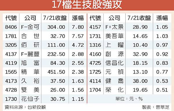 17檔生技股強攻 美股生技NBI指數再以4,194點持續創下歷史新高,生技展登場等利多發威,如F-金可(8406)、合世(1781)等17檔生技股強攻,後市不可小覷。 國泰證期顧問處協理簡伯儀說,NBI指數再以4,194點續創歷史新高價,雖台股生技醫療指數昨下跌1.28點收在71.89點,跌幅高達1.75%為台股跌最大族群,但細看個股,卻有F-金可、合世、佰研、F-麗豐、旭富、精華等高達17檔強過台股漲幅0.34%,凸顯應┌選股不選市┘股市操作法則重要性。而生技股應屬漲多回檔,在美NBI指數續創歷史新高下,生技指數後續將跟進上攻。 元大投顧薛舜日經理說,進入7月生技月,過去兩年生技股走多頭時,族群股價通常在生技月前領先兩個月表態,但自去年基亞事件後,類股線型走空對題材反應漸鈍化。目前因整體生技族群股價處低基期,應有機會在7月23日登場台北生技展前展開熱身。 薛舜日說,隱形眼鏡族群,元大投顧看好F-金可在中國市場將有穩健成長機會,今明年EPS可達17.4元及22元,營運展望勝過精華。F-麗豐今年受惠新增商標授權金推升,今明年EPS可達10.9元、13.6元。