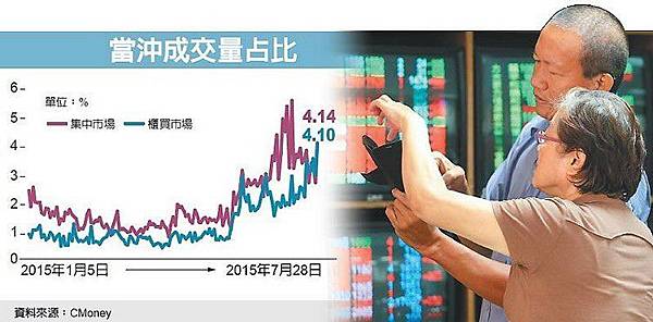 櫃買市場昨天當沖的張數,占全場成交比重達4.01%,寫下歷史新高,意味每100張交易量,就有超過4張是當沖,較4月底萬點行情時,當沖比重不到1%的狀況暴增。當沖比重大幅拉升,顯示市場投資人持股信心相當薄弱。同時,櫃買昨天當沖成交金額占整體成交金額比重高達13%,也是歷史次高記錄,也較今年上半年普遍在3%至6%的水準倍增。集中市場投資人也大玩沖沖樂,當沖買進、賣出金額昨爆出88億元的大量,也明顯較上周的六、七十億元大增,占成交比重也達8.78%,較4月底萬點行情時的4%倍增;當沖成交張數占市場成長張數比重達4.14%,較前四月普遍在2%以下的水準,也呈現倍增的狀況。