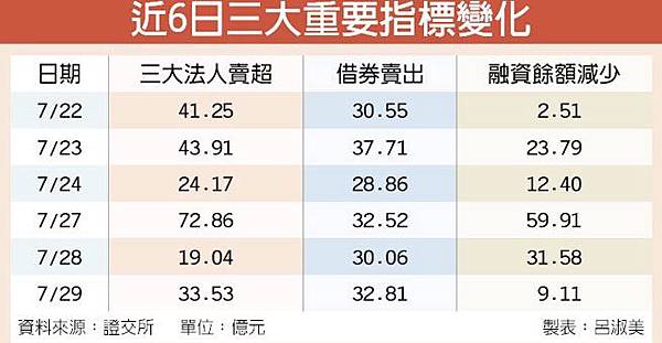 台股連日盤中創新低,法人、融資、借券賣出呈現持續偏弱,三大法人昨(29)日合計賣超33.53億元,融資餘額持續減少9.1億元,借券賣出32.81億元。