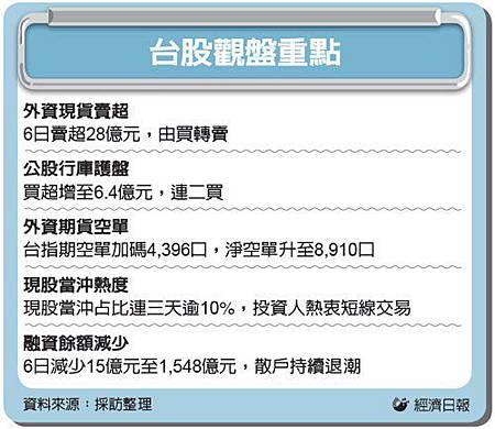 台股呈現兩大不利的特色,第一為現股當沖躍為台股熱門交易工具,已占台股比重超過一成,投資人熱衷短線交易,除了對明日行情不確定性太高外,台股因融資退潮而無券可放空,投資人轉向可先賣後買的現股當沖交易工具。