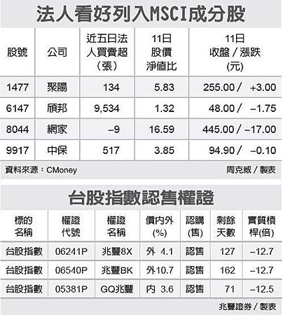 在個股方面,今年第2季個股的表現,市場排名居前100名,自由流通比率高,且尚未納入MSCI成分股的有聚陽、網家、頎邦、中保、川湖、建大等,其中聚陽、網家、頎邦及中保當季排名大幅進步,預計在這次的季度調整中有機會納入。 其中,南亞科、裕日車、全家、F-鼎固於第2季市值排名雖然依舊居前,但自由流通比率分別僅有14.1%、6.9%、12.8%、2.1%,仍屬於偏低的水準,因此此次入選的機會仍低。另外,漢翔、富邦媒雖市值排名躍升至101名與102名,但自由流通比率均僅有10.2%,入選機率不大。 法人機構並指出,今年第2季排名最落後的三檔個股,包括中華車市值排名未明顯提升,加上陽明與台玻排名大幅衰退,需提防此次有遭到移除的風險。
