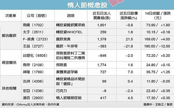經濟日報 記者簡威瑟/台北報導 8月20日是傳統的七夕情人節,引動「愛情產業」成為近來市場的熱門話題,包括餐飲業、飯店與摩鐵(Motel)等與情人節商機相關的領域,均成為市場關注的焦點。 本報系資料庫 分享8月20日是傳統的七夕情人節(農曆7月7日),引動「愛情產業」成為近來市場的熱門話題,包括餐飲業、飯店與摩鐵(Motel)等與情人節商機相關的領域,均成為市場關注的焦點,預期相關「情人節概念股」,將成為台股多頭搶短的焦點之一。 儘管市場上並無明確統計相關情人節商機有多大,不過,根據AC尼爾森對一般消費產品的調查統計,台灣保險套年銷售量以15.6%的幅度逐年成長;台灣的摩鐵也逾千家,年產值超過700億元。