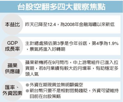 台股大盤昨(18)日第三天破底,市場法人列出台股本益比、經濟成長率變化、蘋果拉貨啟動及外資動向等四大因素,將逐漸支持大盤由空翻多,明日公布的7月外銷訂單等經濟數據,將是中多買盤是否迅速歸隊的關鍵。